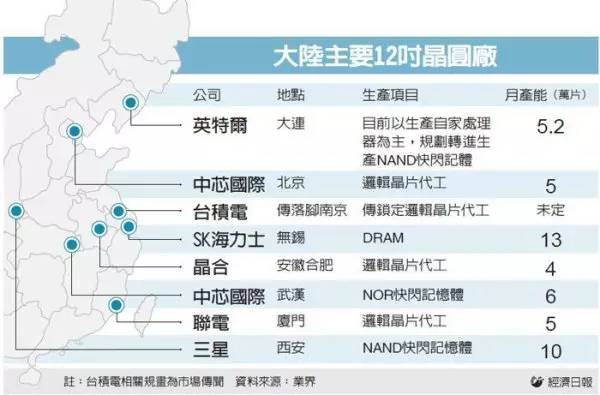 中国订下2025年成为全球制造大国目标,为卡位中国制造(MIC)商机,包括英特尔、联电、力晶、三星、海力士、中芯国际等大厂均扩大在中国布局。目前在大陆投资设12寸晶圆厂的业者,主要锁定晶圆代工与内存制造两大领域。